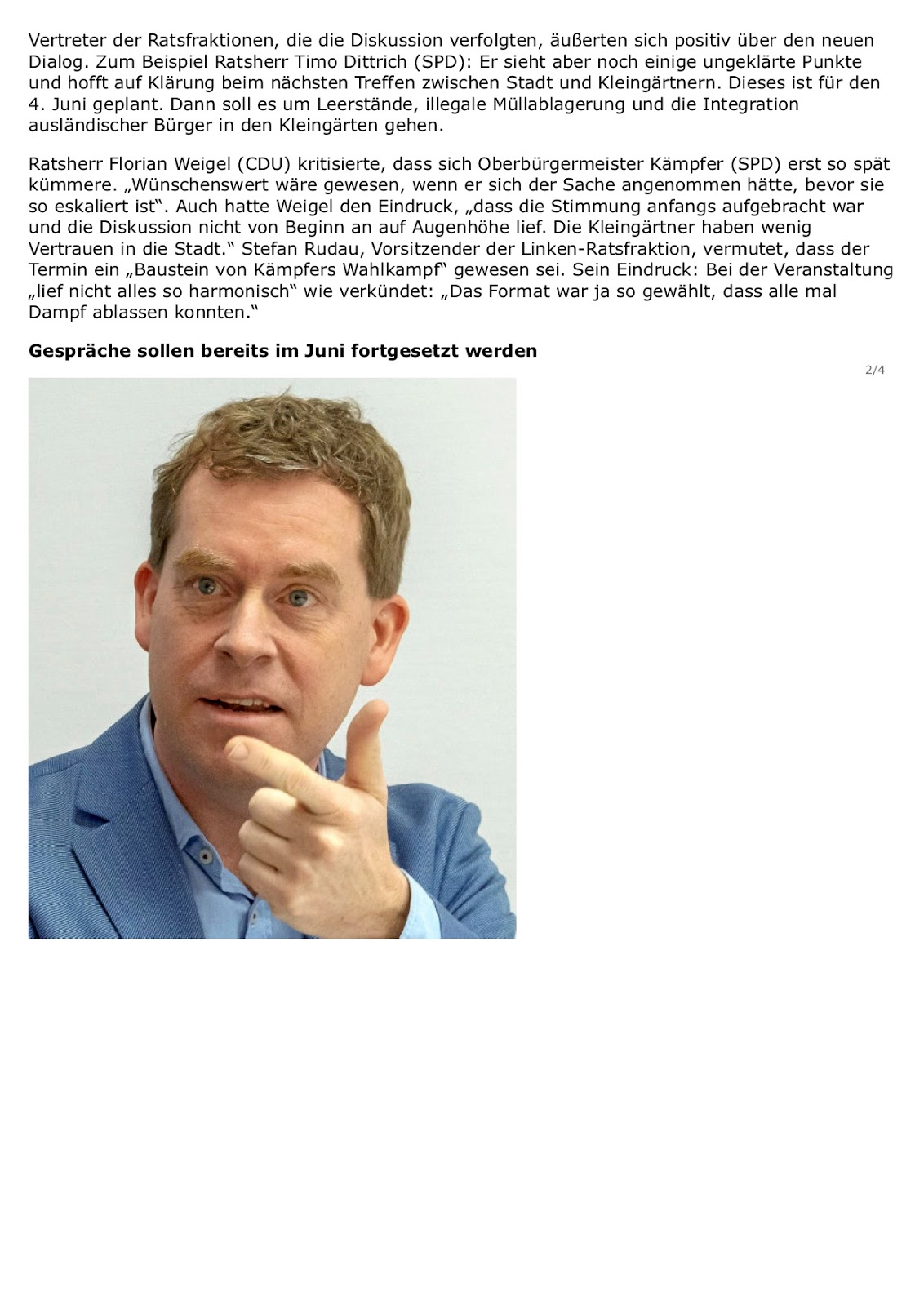 Nachdem die Kleingärtner nach heftiger Diskussion der Vereinbarung mit Mehrheit zugestimmt haben, sieht Werner Müller, Vorsitzender des Kleingärtner-Verbandes, ebenfalls eine Chance auf einen Neubeginn: „Wir haben einen guten Vergleich geschlossen, um Ruhe in die Gesamtorganisation zu bekommen.“